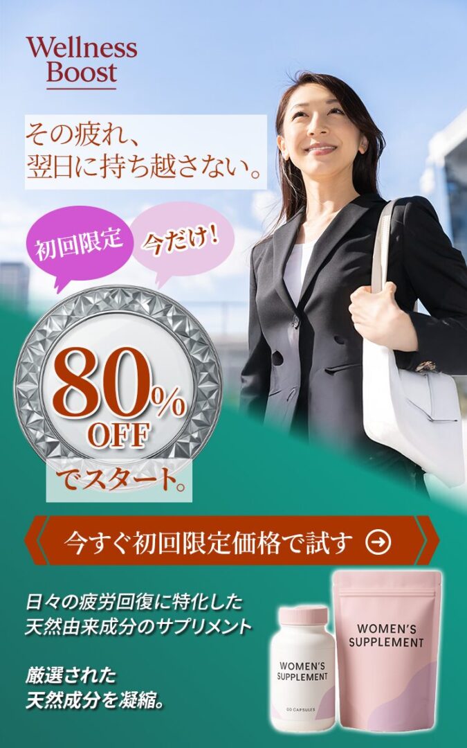 概要日々の疲労回復に特化した、天然由来成分の高級サプリメントの定期購入を促すバナー。初回限定割引を強く訴求する。